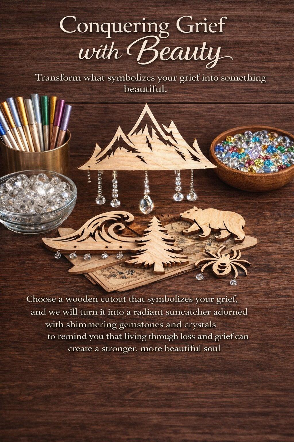 Choose a wooden cutout that symbolizes your grief, and we will turn it into a radiant sun-catcher adorned with shimmering gemstones and crystals to remind you that living through loss and grief can create a stronger, more beautiful soul
